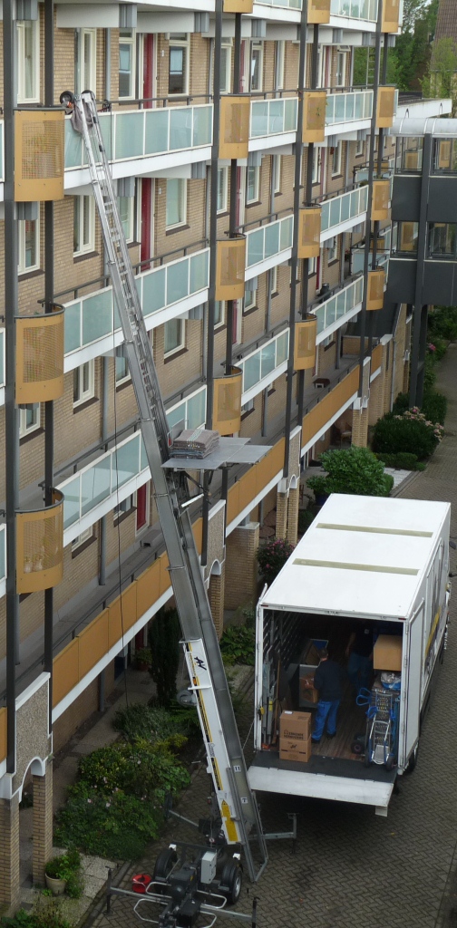 Verhuizen vanaf een appartement of een lastige trap? Wij maken het u graag makkelijk met onze mooie verhuislift! Onze verhuislift kan tot 27 meter hoogte bereiken en is zo tot de 9e verdieping ideaal te gebruiken.